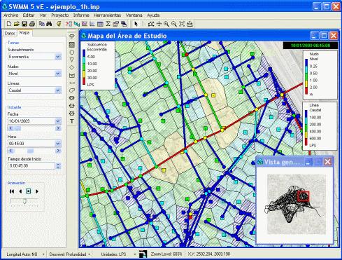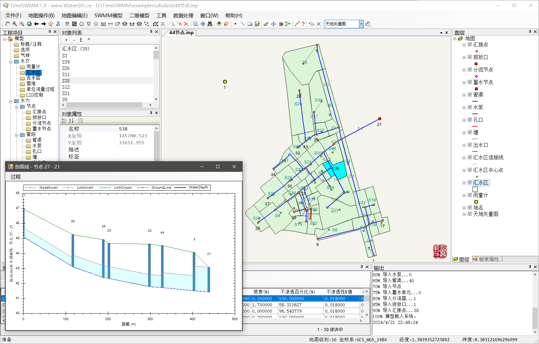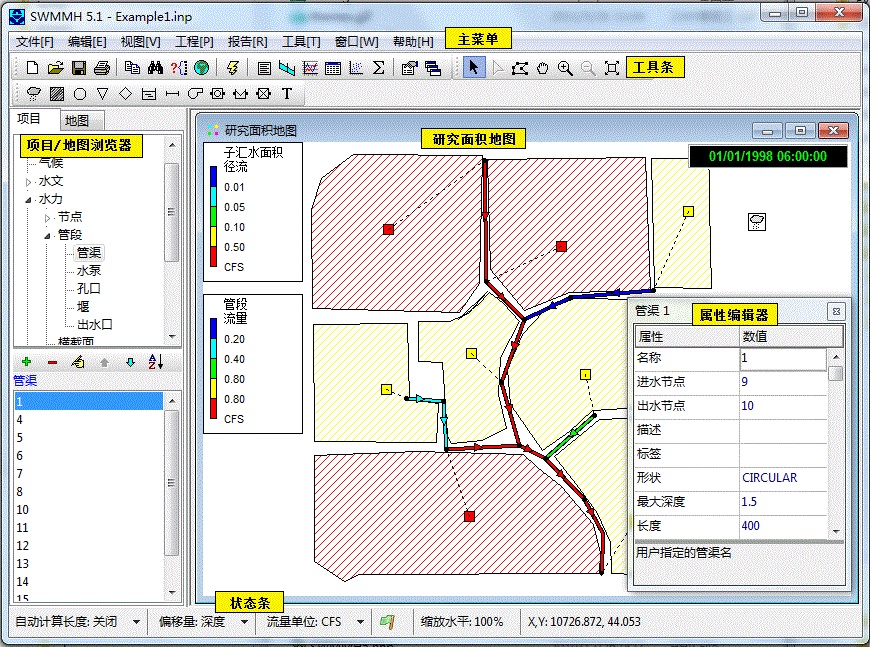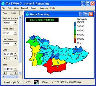 并可以用多种形式对结果进行显示,包括对排水区域和系统输水路线进行彩色编码,提供结果的时间序列曲线和图表、坡面图以及统计频率的分析结果。